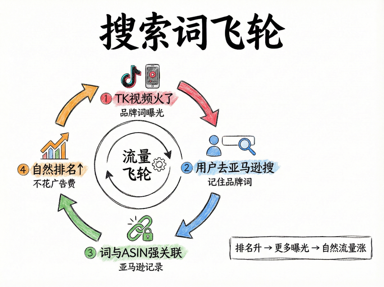 第一层:搜索词飞轮TK上一条视频火了,用户记住了你的品牌词或者产品关键词,然后跑到亚马逊去搜。亚马逊会记录到"这个词和你的ASIN有强关联",你在这个词上的自然排名就会上升。排名上升了,更多人搜到你,你不用花更多广告费,自然流量就涨了。