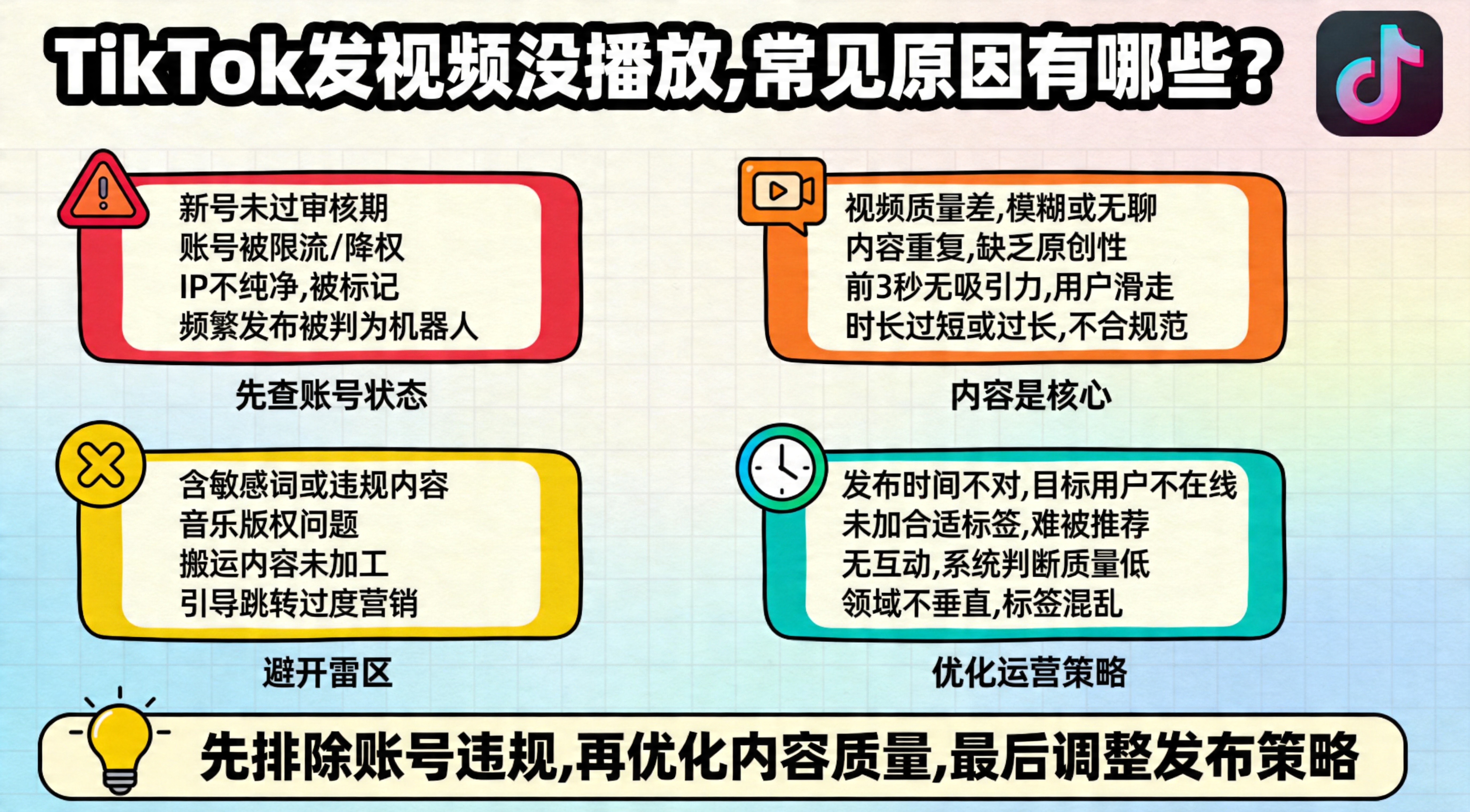 TikTok 发视频没播放,很多时候并不是平台“故意不给流量”,而是账号和内容没有释放出足够好的初始信号。常见原因通常集中在账号基础薄弱、视频前几秒抓不住人、素材重复度过高、发布行为不稳定、内容方向与目标用户不匹配,以及账号整体运营痕迹太弱。真正有效的解决思路,不是盲目多发,而是先弄清楚问题到底出在账号、内容还是操作节奏上。只有把前3秒、原创度、发布习惯和账号基础一起理顺,视频播放才更容易慢慢回到正常轨道。