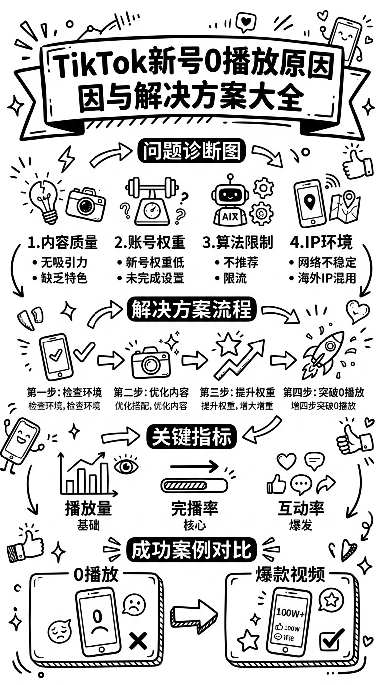 TikTok新号0播放是很多新手遇到的问题。本文整理了0播放的所有可能原因和对应的解决方案,帮助你快速定位问题并解决。