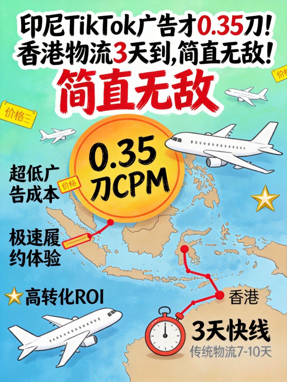 核心关键词:印尼TikTok广告, 香港物流3日达, 0.35刀CPI, TikTok Shop印尼, 香港卖家东南亚, 印尼COD物流, 印尼Halal市场, 香港空运印尼