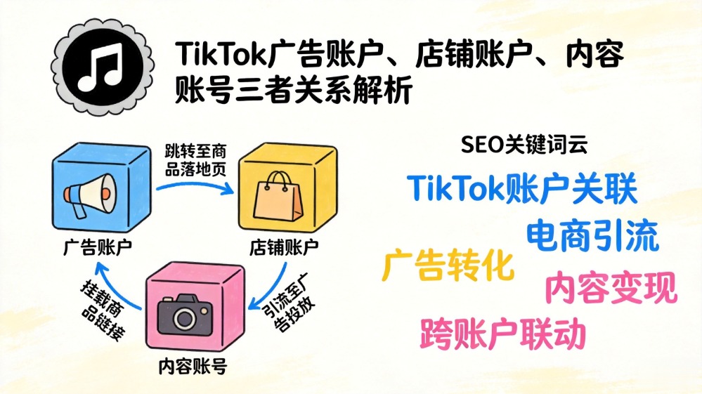 TikTok 广告账户、店铺账户、内容账号之间是什么关系?本文从流量获取、内容运营、商品承接和账号协同角度,系统讲清三者在 TikTok 运营中的真实关系。