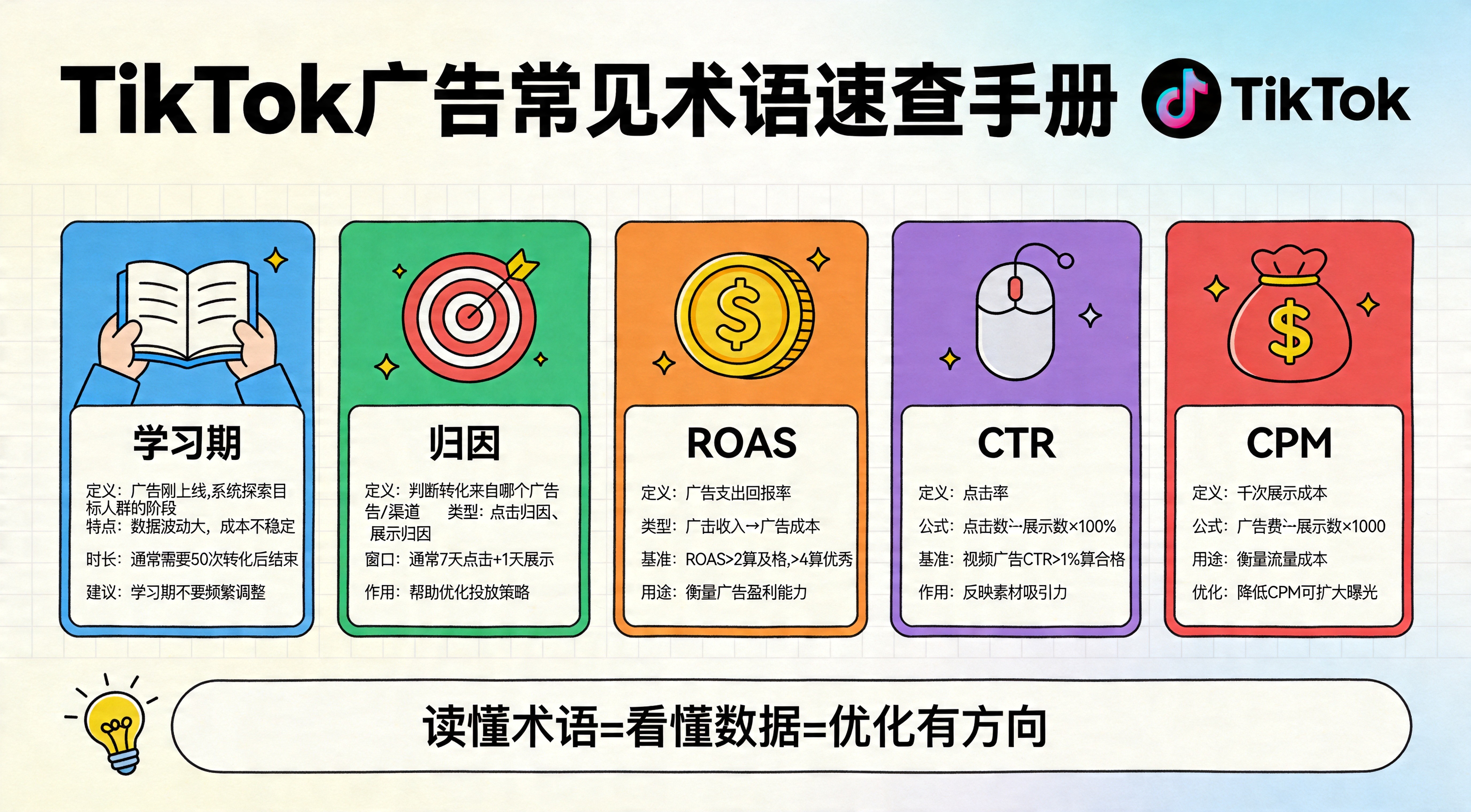 TikTok 广告术语看不懂怎么办?本文系统解释学习期、归因、ROAS、CTR、CPM 等高频概念,并结合投放场景说明这些指标在优化里到底该怎么看。