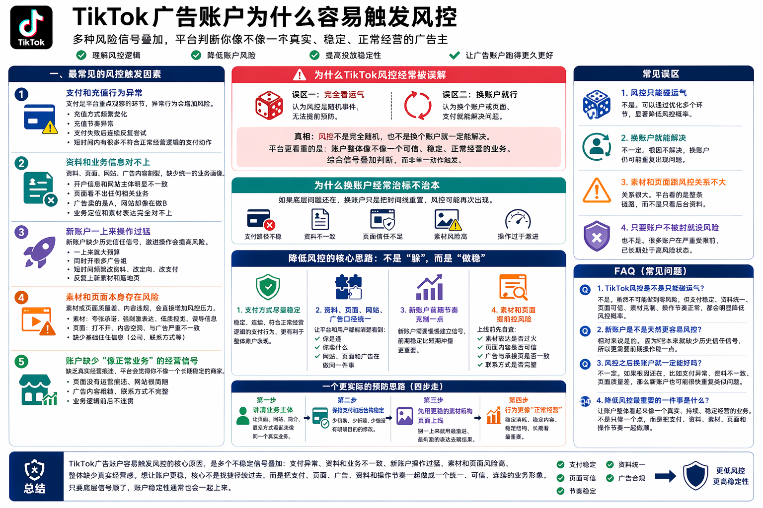 简介TikTok 广告账户为什么容易触发风控?本文从支付、资料一致性、操作节奏、素材页面质量和账户基础信号出发,系统分析常见原因和更稳的预防思路。 ...