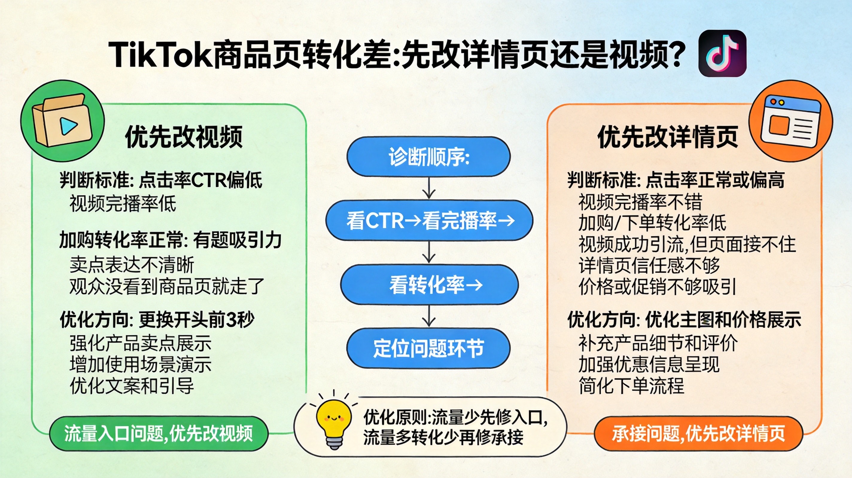 TikTok 商品页转化差时,真正要解决的不是“先改哪个更高级”,而是先判断问题到底卡在: