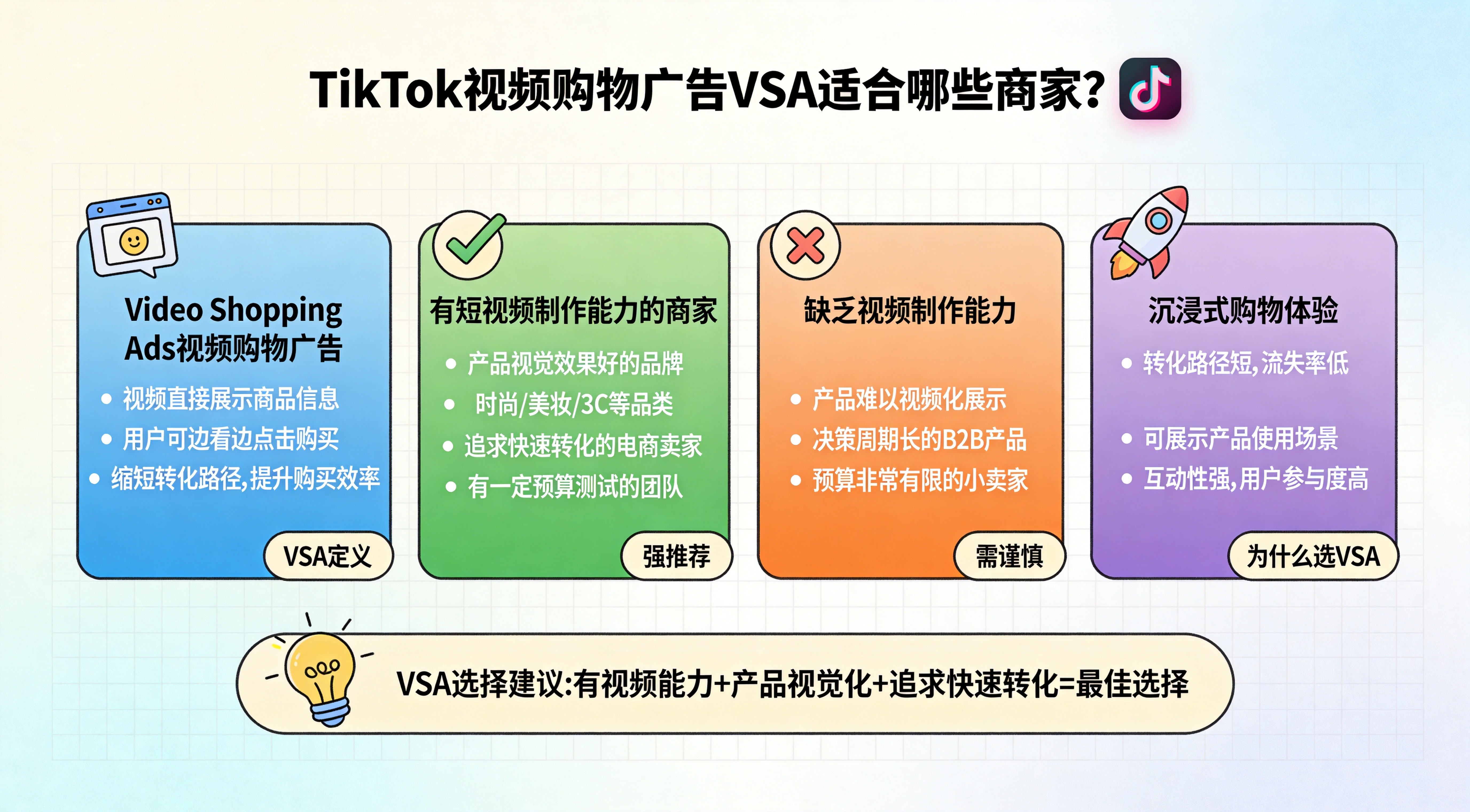 简介TikTok 视频购物广告 VSA 适合哪些商家?本文从商品特征、内容能力、页面承接、投放阶段和常见误区出发,系统分析 VSA 更适合什么类型的商家和商品。 ...